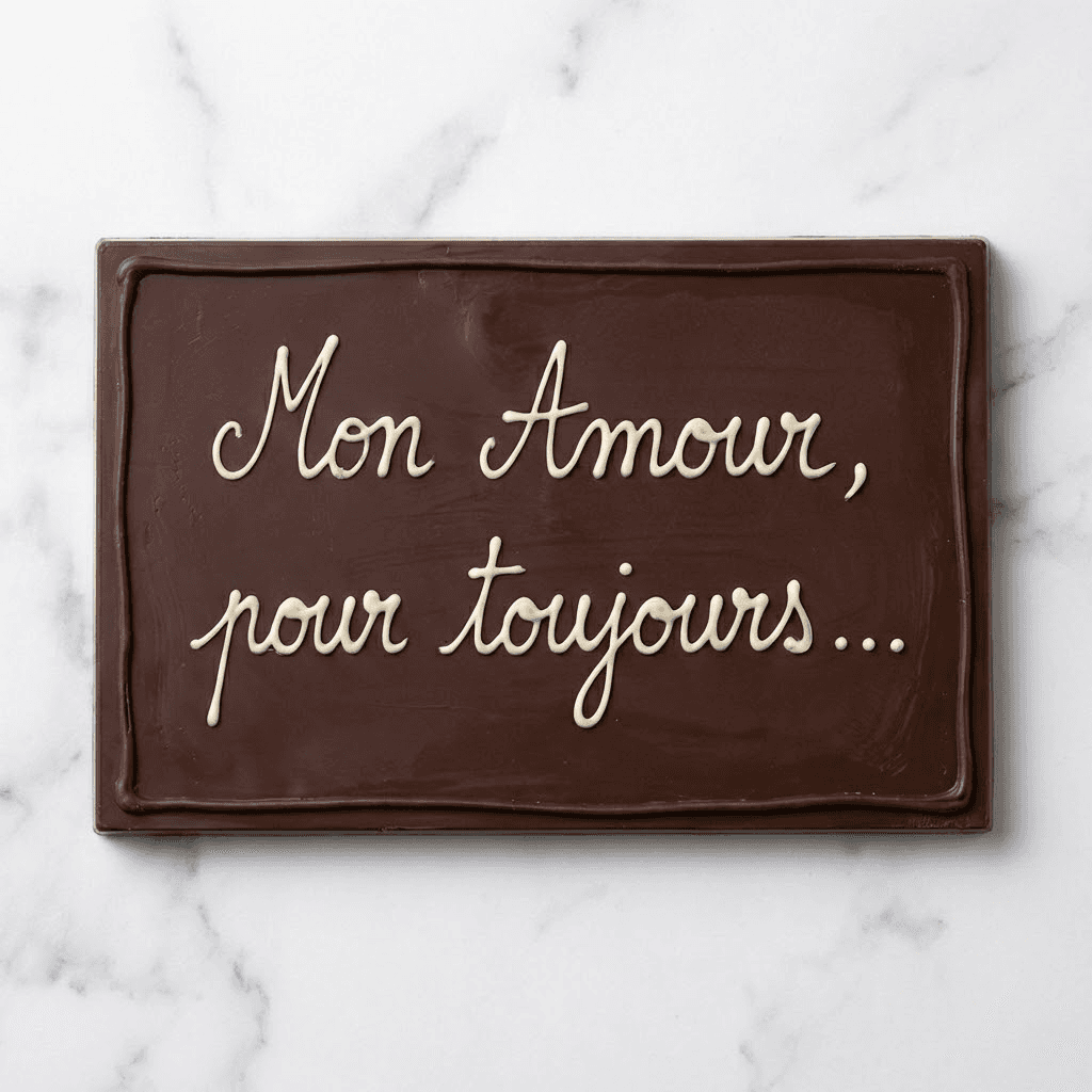 Votre message manuscrit, reproduit fidèlement en chocolat blanc sur fond noir intense.